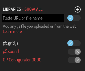 あなたにとって、または特定のユースケースにおいて、p5.js本体の機能だけでは不便に感じることもあるでしょう。p5.jsは幅広いユーザーをターゲットとしているので、ニッチな機能を本体に組み込むことはあまりいいアイデアではないと理解できると思います。そこで、アドオンライブラリの出番です。p5.jsで扱いやすい便利機能を、自由に作ることができます。