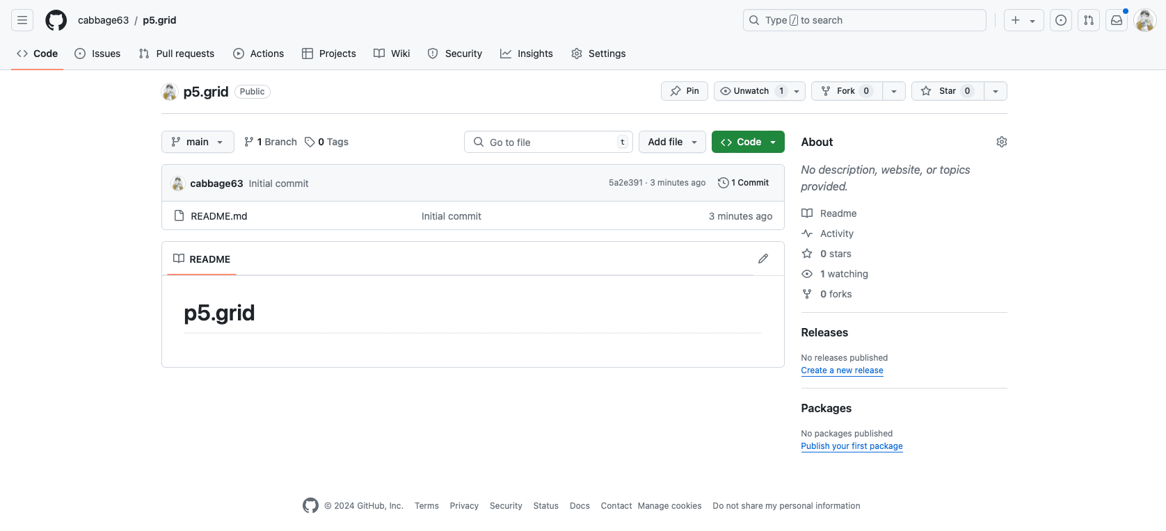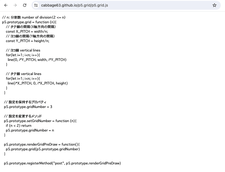 https://cabbage63.github.io/p5.grid/p5.grid.js組み立てたURLにアクセスすると、ライブラリのJavaScriptファイルが表示できるはずです。次のセクションで使用するので、このURLを控えておきましょう。