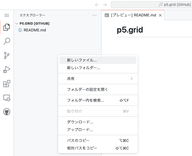 「エクスプローラ」と書かれたエリアで右クリックし、JavaScriptファイルを作成しましょう。このまま配布されるライブラリのファイル名になるので、ライブラリ名を含んだファイル名にするのがよいでしょう。今回の例ではp5.grid.jsとします。