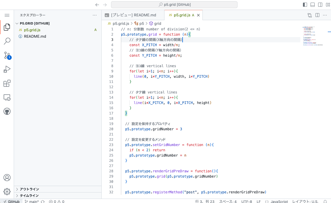p5.prototype.registerMethod("post", p5.prototype.renderGridPreDraw)まず、19-20行目で、gridNumberというプロパティを用意します。この値をマス目の分割数として使用することを意図しています。デフォルト値として3を設定しました。
