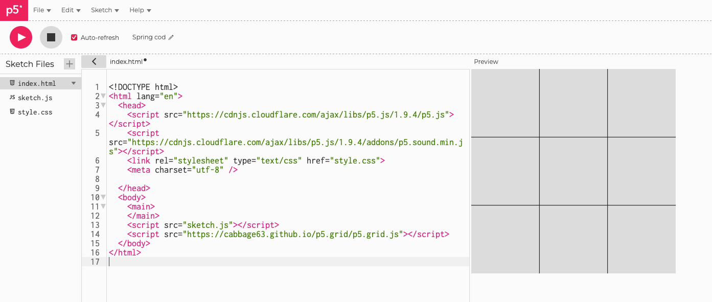 まずは通常のスケッチを書くように、p5.js Web Editorでgrid関数を作るところから始めましょう。