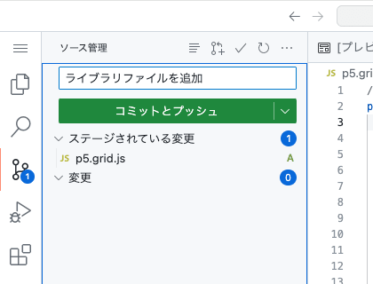 先ほど作成したJavaScriptファイルの行の「+」ボタンを押して、ファイルをステージングします。